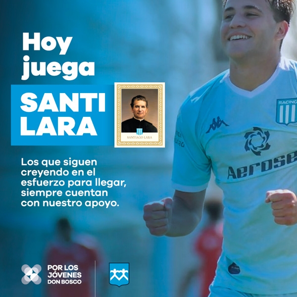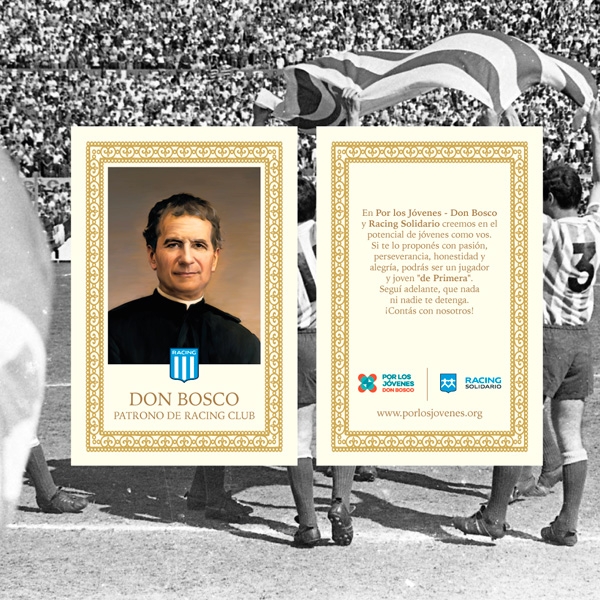 La campaña se llamó “Jóvenes de Primera” y tomó como punto de partida una historia muy conocida entre los racinguistas: la del mítico gol de Chango Cárdenas, quien aquel día llevaba una estampita de Don Bosco en las canilleras. Inspirados por esa anécdota, se entregaron estampitas del santo a los jóvenes de las divisiones inferiores del club como un gesto simbólico de acompañamiento en su camino hacia primera. Fue una manera de unir espiritualidad, esfuerzo y sueños, pilares comunes tanto del deporte como del carisma salesiano.